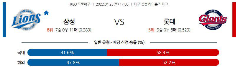 전일 경기에서는 롯데가 8-2 승리를 기록하며 시리즈 기선제압에 성공했다. 시즌 9승8패 성적. '포스트 이대호 ‘한동희가 홈런포를 가동하는 가운데 13안타(3홈런)를 폭발 시켰고 반즈 투수가 7이닝 무실점 승리투로 에이스의 위엄을 선보인 경기. 반면, 삼성은 최근 7경기 1승6패 흐름 속에 시즌 7승11패 성적. 지난시즌 롯데의 천적으로서 모습을 보여준 백정현 투수가 시즌 초반 연속 된 부진에 빠졌다는 것이 패배의 아픔 보다 더 큰 고민으로 남게 되었고 10안타, 9개 잔루를 기록한 경기.