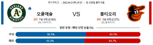 4월 21일 07:07 MLB 오클랜드 : 볼티모어