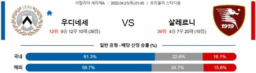 세리에A 4월 21일 01:45 우디네세 칼초 : US 살레르니타나 1919