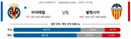 스페인 프리메라리가 4월 20일 04:30 비야레알 : 발렌시아