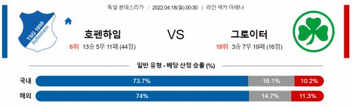 독일 분데스리가 4월 18일 00:30 TSG 1899 호펜하임 : SpVgg 그로이터 퓌르트