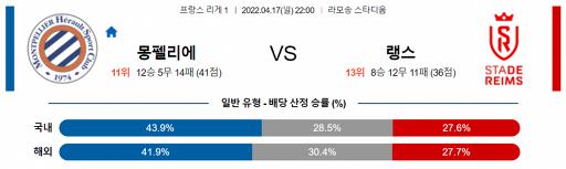 열람중 프랑스 리그앙 4월 17일 22:00 몽펠리에 HSC : 스타드 드 랭스 2022.04.17 455