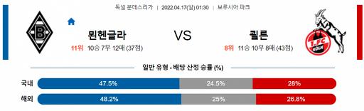 열람중 독일 분데스리가 4월 17일 01:30 보루시아 묀헨글라트바흐 : FC 쾰른 2022.04.16 409