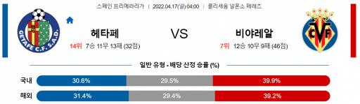 스페인 프리메라리가 4월 17일 04:00 헤타페 CF : 비야레알