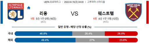 UEFA 유로파리그 4월 15일 04:00 올랭피크 리옹 : 웨스트햄 유나이티드
