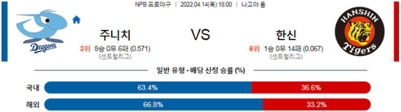 선발 싸움에서 제법 차이가 발생하는 매치업이며 한신 타선은 차갑게 얼어 붙어 있다. 주니치 승리 가능성을 추천 한다.