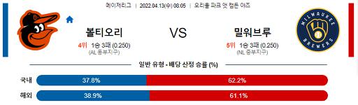 4월 13일 08:05 MLB 볼티모어 : 밀워키