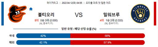 밀워키의 승리를 본다. 볼티모어는 개막 시리즈에서 템파베이를 만났는데 마운트캐슬과 산탄데르를 제외한 선수들의 타격감이 좋지 않았다. 리그와 지구가 모두 다르기에 쉽게 만나기 어려운 밀워키 소속의 하우저 상대로 적응에 시간이 필요하다. 밀워키는 시즌 초반 출발이 좋지 않지만 매커친과 아다메스, 렌프로등 좌투에 강한 타자들이 라인업에 충분하다. 하우저에게 득점 지원을 해줄 수 있다.