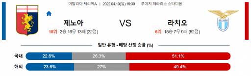 이탈리아 세리에A 4월 10일 19:30 제노아 CFC : SS 라치오