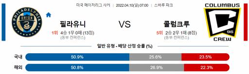 미국 MLS 4월 10일 07:00 필라델피아 유니언 : 콜럼버스 크루