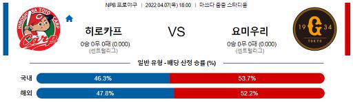전일 경기에서는 요미우리가 2-1 승리를 기록하며 화요일 경기 패배를 설욕하면서 시리즈 균형을 맞추는데 성공했다. 시즌 9승2패 성적. 상대 보다 안타 숫자는 2개 부족했지만 0-1로 끌려가던 경기를 8회 역전한 경기. 반면, 히로카프는 최근 5경기 1승4패 흐름 속에 시즌 7승4패 성적. 토코다 히로키 투수의 선발 경기에서 연승을 만들지 못한 것이 아쉬움으로 남았고 중심 타선이 제 역할을 하지 못한 경기. 홋타 켄신 투수는 시범경기와 정규시즌에 등판한 경기에서 모두 무실점을 기록하고 있다. 달리고 있는 말 등에 올라타야 하는 경기다. 요미우리 승리 가능성을 추천 한다.