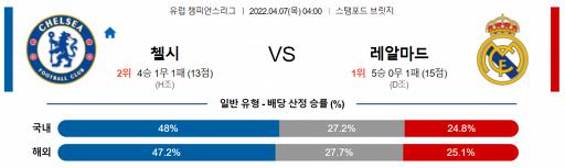 UEFA 챔피언스리그 4월 7일 04:00 첼시 FC : 레알 마드리드 CF