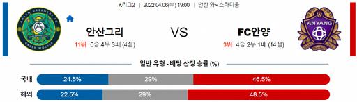 K리그2 4월 6일 19:00 안산 그리너스 FC : FC 안양