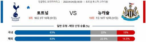 프리미어리그 4월 4일 00:30 토트넘 홋스퍼 FC : 뉴캐슬 유나이티드 FC
