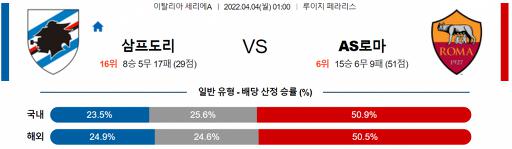 세리에A 4월 4일 01:00 UC 삼프도리아 : AS 로마