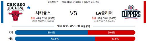 4월 1일 09:00 NBA분석 시카고 : LA클리퍼스