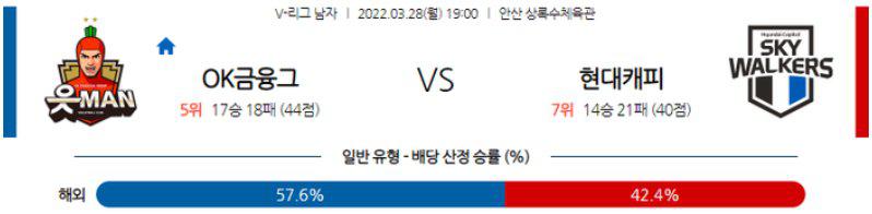 OK저축은행은 레오, 차지환, 곽명우 세터가 부상을 당했고 결장이 이어지고 있다. 반면, 현대캐피탈은 펠리페와 김명관 세터가 돌아온 상황. 현대캐피탈 승리 가능성을 추천 한다.