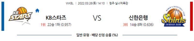 PO를 준비라는 과정에서 식스맨들의 출전 시간이 늘어날 것으로 예상되며 직전경기에서 주전 선수들의 공백을 메우며 삼성생명을 제압한 KB스타즈의 식스맨 전력이 우위에 있다. 또한, 코로나 격리에서 돌아온 주축 선수들도 컨디션 점검을 위해서 일정 시간 경기가 투입 될 것으로 예상되는 KB스타즈가 된다. KB스타즈 승리 가능성을 추천 한다.