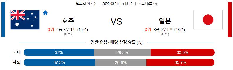 무승부를 점친다. 원정이라는 점과, 피지컬을 이용한 수비에 일본이 고생했던 전적이 많은 만큼 일본이 고전할 가능성이 크다고 본다. 다만 호주도 주력 공격수들의 체력적 문제와, 감독의 부재라는 큰 변수가 존재한다. 일본도 무리하지 않고 수비에 힘쓸 가능성이 높다. 저득점 페이스가 유력하다.
