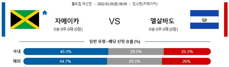 자메이카가 우세한 승부다. 다만 다득점을 기대하기는 어렵다. 안토니오를 제외하면 A매치에서 눈에 띄는 득점력을 보이는 선수도 없고, 홈에서 5경기 2득점에 그치고 있다. 다만 엘살바도르도 공격진에서 믿을 만한 선수가 없는 것은 마찬가지다. 언더(2.5)를 예상하는 이유다.