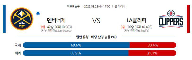 덴버가 니콜라 요키치를 앞세운 하이포스트 공격 조립으로 LA클리퍼스 수비를 무너뜨릴수 있을 것이다. 덴버 승리 가능성을 추천 한다.