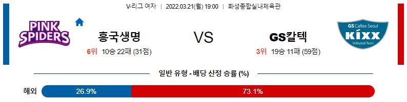 팀 리시브 최하위를 기록중인 흥국생명의 리시브 불안이 팀 공격 성공률의 차이를 만들 것이다. 또한, GS칼텍스는 전체 서브 2위를 기록중인 팀 이다. GS칼텍스 승리 가능성을 추천 한다.