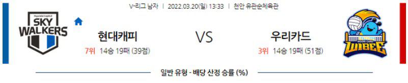 현대캐피탈은 직전경기(3/17) 홈에서 삼성화재 상대로 3-2(25:22, 20:25, 25:17, 29:31, 16:14) 승리를 기록했으며 이전경기(3/13) 원정에서 대한항공 상대로 0-3(20:25, 21:25, 21:25) 패배를 기록했다. 7연패에서 벗어나는 승리가 나왔으며 시즌 14승19패 성적. 삼성화재 상대로는 펠리페(2득점, 40%)가 1세트 이후 웜업존으로 물러났지만 드래프트 1순위 신인 홍동선(13득점, 52.38%)이 커리어 하이 득점을 기록하며 새로운 활력소가 되었고 허수봉(24득점, 63.64%)의 부활이 나온 경기. 50%의 높은 리시브 효율성이 나오면서 김명관 세터의 공백을 이원중, 김형진 세터가 최소화 할수 있었고 수비에서의 끈질긴 모습이 나왔던 상황. 또한, 박상하(13득점, 69.23%)가 중앙에서 힘을 냈고 5세트에는 상대팀 외국인 선수가 전력에서 이탈하는 행운(?)도 도움이 되었던 승리의 내용.