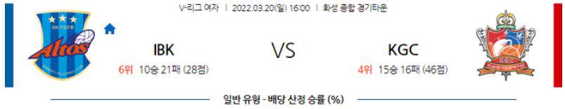 IBK기업은행과 KGC인삼공사 모두 코로나로 홍역을 치렀고 봄배구와 멀어진 가운데 감독들이 6R 일정에서는 "여러 선수들을 기용해 경험을 쌓게 해주겠다고 ”밝힌바 있다. 다만, IBK기업은행 김호철 감독은 KGC인삼공사와 경기에서 베테랑 선수들을 완전히 제외를 시키지 않는 가운데 교체로 투입하겠다고 밝혔고 KGC인삼공사 이영택 감독은 주전 세터 염혜선이 돌아온 가운데 미들 블로커 박은진(발목부상)을 제외한 모든 선수들이 14일 부터 모여서 훈련을 하고 있고 김호철 감독의 부임 이후 만난 IBK기업은행에게 모두 패배를 당했기 때문에 승리를 위한 선수 운영을 가져가겠다고 밝혔다. 또한, 봄배구 전망은 밝지 않지만 아직 탈락이 확정 된 KGC인삼공사는 아니다. KGC인삼공사 승리 가능성을 추천 한다.