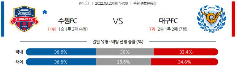 저득점 페이스를 예상하겠다. 대구는 주포를 잃었고, 수원FC도 직전 경기 오픈 플레이에서 인상적이지는 못했다. 대구가 체력적 부담은 있으나, 경합에서 장점을 보이는 것을 이용하면 실점을 최소화 할 수 있다. 언더(2.5)와 무승부가 예상되는 경기다.