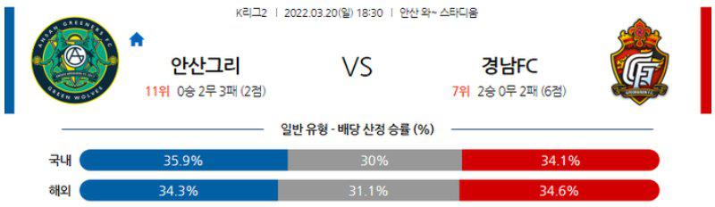 언더(2.5)가 주력이다. 양 팀이 모두 외국인 공격수들이 결장하여, 공격진에서는 누수가 크다. 안산이 수비 시 미스가 많고, 경남은 센터백 자원들의 복귀로 수비에서 한 숨 돌렸다. 경남이 근소하게 우세하다고 본다.