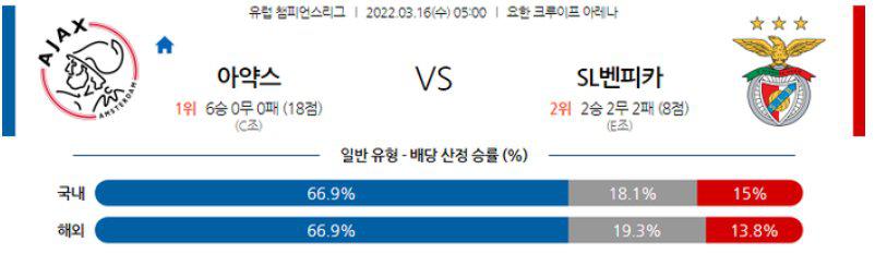 다득점 페이스는 유력하다. 벤피카가 유럽대항전 원정 경기에서는 무득점 빈도가 많지만, 이번 경기에서는 공격적으로 나설 것이 분명하다. 아약스 역시 1~2선의 유기적인 움직임과 연계로 많은 득점을 기대해볼 만 하다. 게다가 아약스는 골키퍼 문제를 가지고 있기도 하다. 승부에서는 현재 페이스와 상대 전적을 고려하면 아약스의 손을 들어주는 것이 옳다고 본다. 오버(2.5)와 홈 승을 예상할 수 있다.