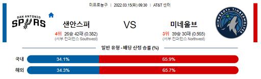 열람중 3월 15일 NBA분석 샌안토니오 : 미네소타 2022.03.15 510