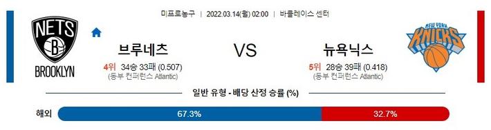 [NBA] 3월 14일 브루클린 vs 뉴욕닉스브루클린은 직전경기(3/11) 원정에서 필라델피아 상대로 129-100 승리를 기록했으며 이전경기(3/9) 원정에서 샬럿 상대로 132-121 승리를 기록했다. 2연승 흐름 속에 시즌 34승33패 성적. 필라델피아 상대로는 카일리 어빙(22득점, 5어시스트)이 양질의 백코트 볼 핸들러+득점원이 되었고 케빈 듀란트(25득점, 14리바운드)가 어빙과 함께 승부처를 접수하며 해결사가 되었던 경기. 라마커스 알드리지가 결장했지만 안드레 드러먼드가 골밑에서 힘을 냈으며 롤 플레이어들의 플레이도 살아났던 상황. 또한, 세컨 실점을 최소화 했고 세스 커리(24득점)가 친정팀 가슴에 비수를 꽂았던 승리의 내용.