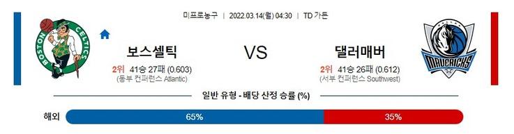 [NBA] 3월 14일 보스턴 vs 댈러스보스턴은 직전경기(3/12) 홈에서 디트로이트 상대로 114-103 승리를 기록했으며 이전경기(3/10) 원정에서 샬럿 상대로 115-101 승리를 기록했다. 5연승 흐름 속에 시즌 41승27패 성적. 디트로이트 상대로는 1옵션이 되는 제이슨 테이텀(31득점)과 세컨 옵션이 되는 제일런 브라운(22득점) 중심으로 만족할수 있는 공격력을 보여준 경기. 마커스 스마트(22득점, 4어시스트)와 윌리엄스가 모두 높은 에너지를 뿜어냈고 알 호포드는 골밑을 사수하며 존재감을 선보였던 상황. 또한, 데릭 화이트(11득점)가 알토란 득점을 성공시켰던 승리의 내용.