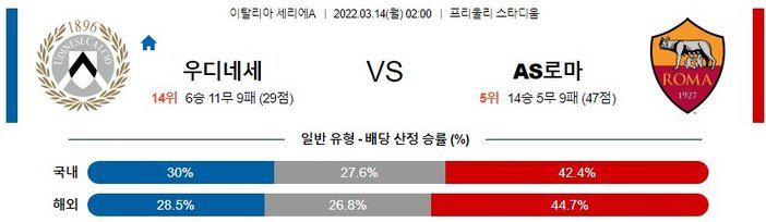 【세리에A】 3월 14일 우디네세 칼초 vs AS 로마