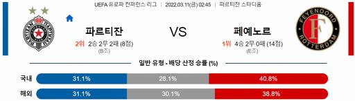 UEFA 유로파리그 3월 11일 02:45 FK 파르티잔 : 페예노르트