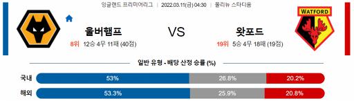 프리미어리그 3월 11일 04:30 울버햄튼 : 왓포드