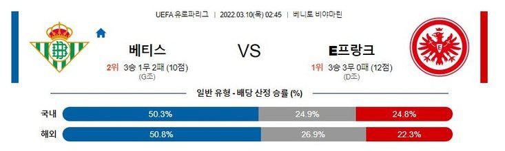 무승부를 점치겠다. 베티스의 화력도 예전만큼은 아니며, 3백을 사용하는 프랑크푸츠트가 전술적으로도 대처가 충분히 가능하다. 베티스가 수비적으로는 안정젇이지 못하지만, 프랑크푸트트도 공격 방향이 매우 단조로워 의외로 많은 득점이 나오지 않을 가능성이 높아보인다. 언더(2.5)와 무승부를 추천한다.
