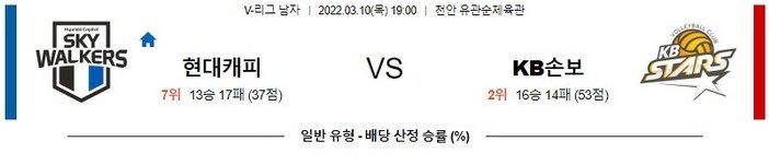현대캐피탈은 직전경기(3/6) 원정에서 한국전력 상대로 2-3(25:27, 19:25, 27:25, 25:16, 9:15) 패배를 기록했으며 이전경기(2/13) 홈에서 OK금융그룹 상대로 0-3(20:25, 25:27, 25:27) 패배를 기록했다. 5연패 흐름 속에 시즌 13승17패 성적. 한국전력 상대로는 허수봉(24득점, 46.81%), 전광인(19득점, 37.50%), 감선호(10득점, 57.14%), 박상하(10득점, 88.89%)가 분전했지만 1세트 도중 허벅지 통증으로 이탈한 펠리페의 공백이 크게 나타난 경기. 46.39%의 만족할수 있는 리시브 효율성을 기록했지만 팀 서브 최하위 팀의 문제점이 나타나면서 상대에게 52.22%의 높은 리시브 효율성을 허락했던 상황. 또한, 서브(1-6), 블로킹(12-16), 범실(29-25) 싸움에서 모두 밀렸던 패배의 내용.