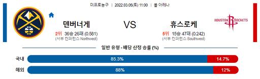 덴버가 니콜라 요키치를 앞세운 덴버가 하이포스트 공격 조립으로 휴스턴 수비를 무너뜨릴 것이다. 덴버 승리 가능성을 추천 한다.