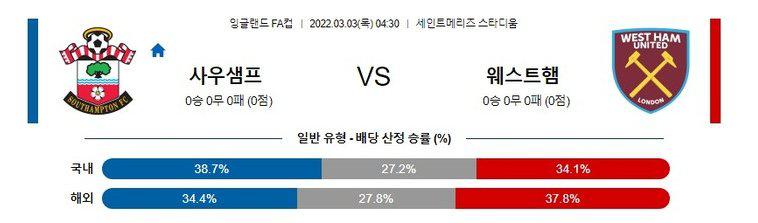 【잉글랜드 FA컵】 3월03일 사우스햄튼 vs 웨스트햄