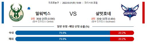 ◈밀워키의 승리를 본다. 샬럿은 플럼리가 버티는 빅맨진에 해럴이 가세했기에 전반기보다 나아진 골밑 경쟁력을 보이고 있다. 그러나, 쿤보와 포르티스, 이바카등 밀워키 빅맨진의 골밑 공략을 버티긴 어렵다. 또, 트랜지션 위주로 템포를 올리는 샬럿 농구 스타일상 홈과 원정을 넘나드는 백투백 일정은 부담스럽다. 쿤보의 높이를 앞세울 밀워키가 승리할 것이다.